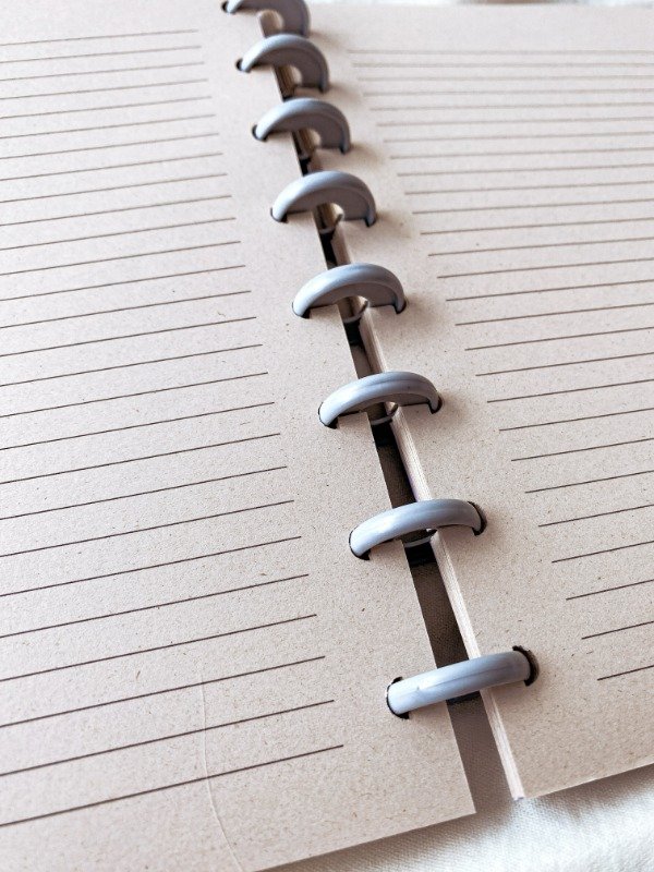 Lo armé con este sistema para que el cuaderno se adapte a tu día y no al revés. Podés sacar las hojas, escribir cómoda sobre el escritorio y volver a ponerlas donde quieras. Si necesitás reorganizar tus notas o cambiar una sección de lugar, lo hacés en un segundo sin arruinar el cuaderno y sin tener que arrancar páginas.